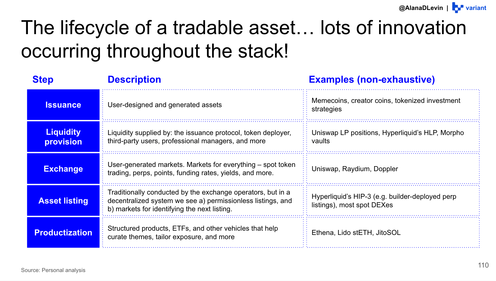 Phase 1 is creation: the tokenization of value. The creation phase started with Bitcoin’s launch in 2009. Since then, it has grown to include layer-1 monetary assets, project tokens, stablecoins, content coins, memecoins, NFTs, tokenized equities, and more. From 2024-2025, the crypto industry moved up the steepest part of the s-curve. We went from ~20k listed, tradable tokens to millions in the course of just a few years. There is still significant room for innovation and growth (tokenized credit, onchain structured products, additional real-world assets, and much more), but the most dramatic zero-to-one moments have already occurred.