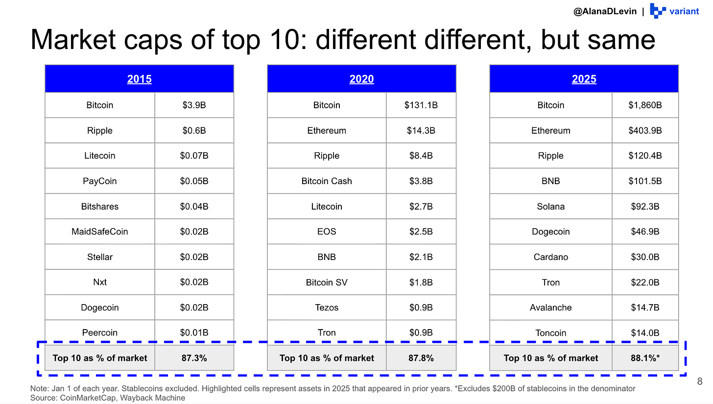 1. Macro. The major crypto assets keep getting bigger. Even as the total market cap of crypto has grown, the concentration of value among the top 10 crypto assets has remained shockingly consistent. It has also been challenging for new assets to enter the top five. There is real Lindy-ness and mimetic power to many of the top assets.