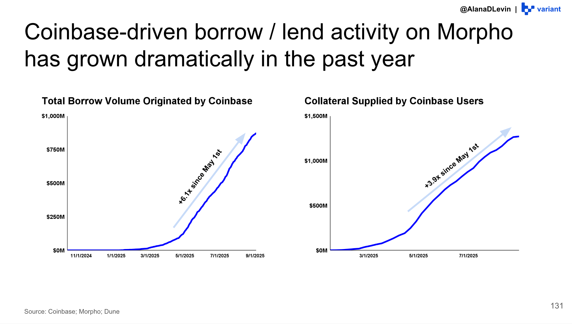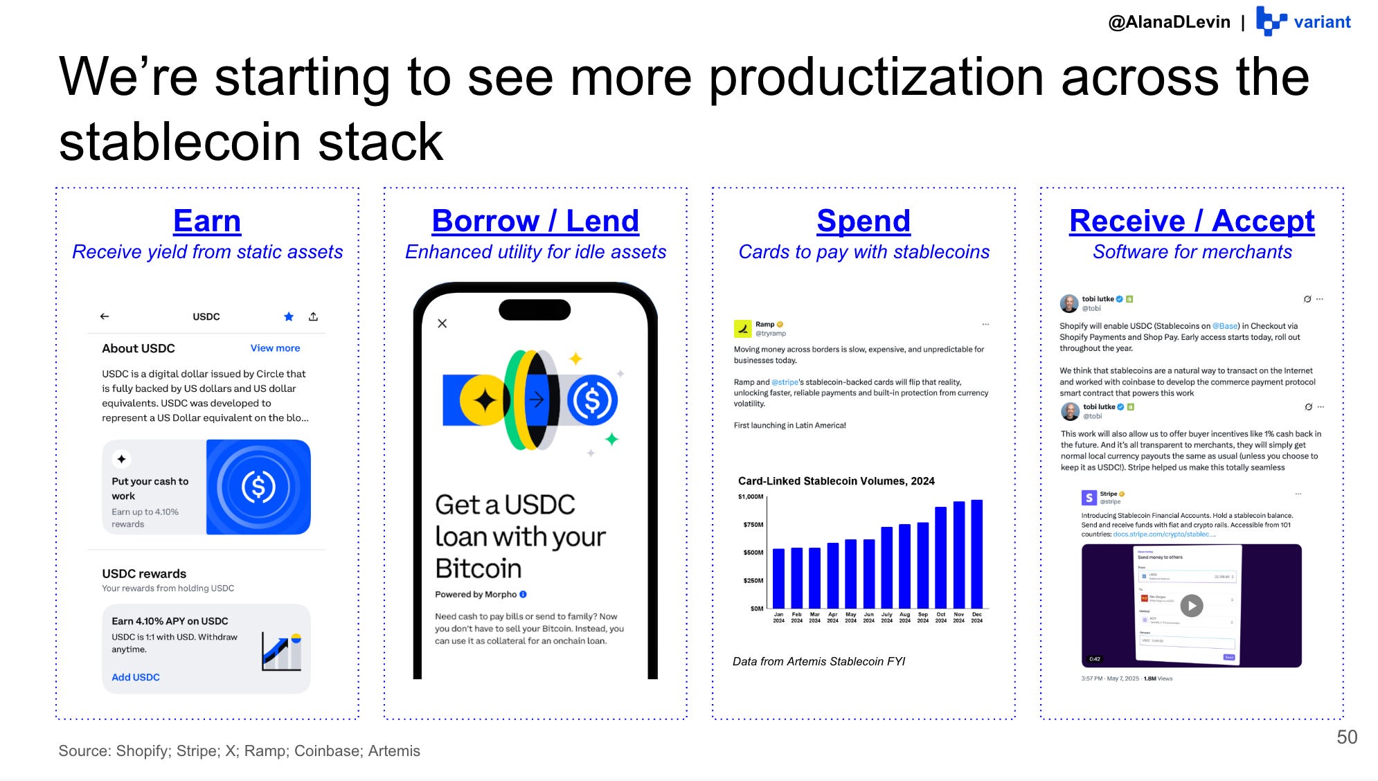 Phase 3 is utilization: putting assets to work. Once people hold assets, they want to start using them. Crypto assets are the most composable, accessible, and programmable financial assets that have ever existed. A number of exciting, robust use cases have begun to emerge: stablecoin payments, supplying & borrowing capital on lending protocols like Morpho, providing liquidity to onchain exchanges, and network staking. Yet we are still at the very early innings of the different ways in which tokenized assets can and will be used; we have barely begun to climb the s-curve. I see the design space for expanding and enabling greater asset utility as some of the largest and most exciting blue ocean opportunities over the coming years.