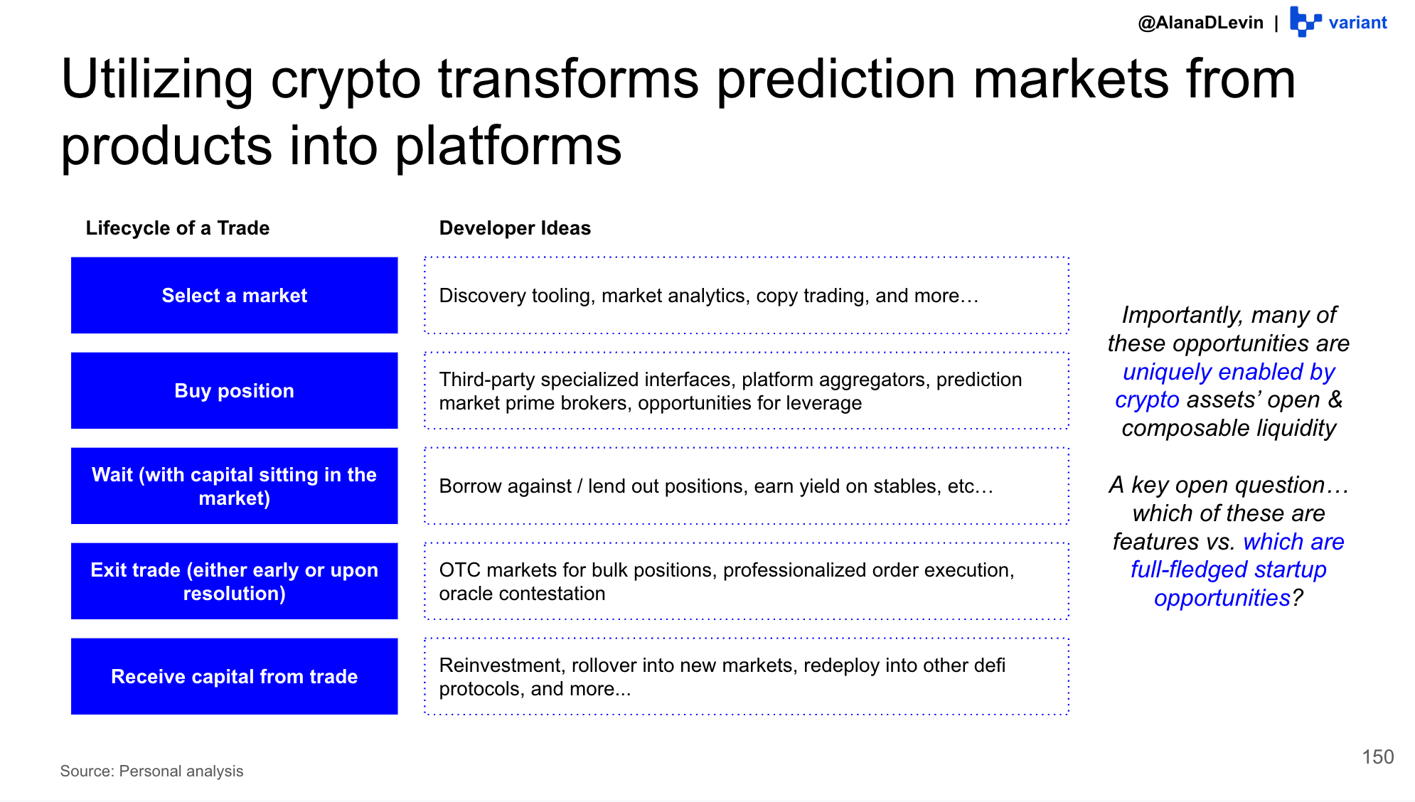 5. What’s Next: Building on crypto rails can transform products into platforms. This section uses the growth in prediction markets as a prime example of a new market that’s supercharged by crypto rails. It also summarizes a (non-exhaustive!) selection of the startup opportunities we’re looking for at Variant.