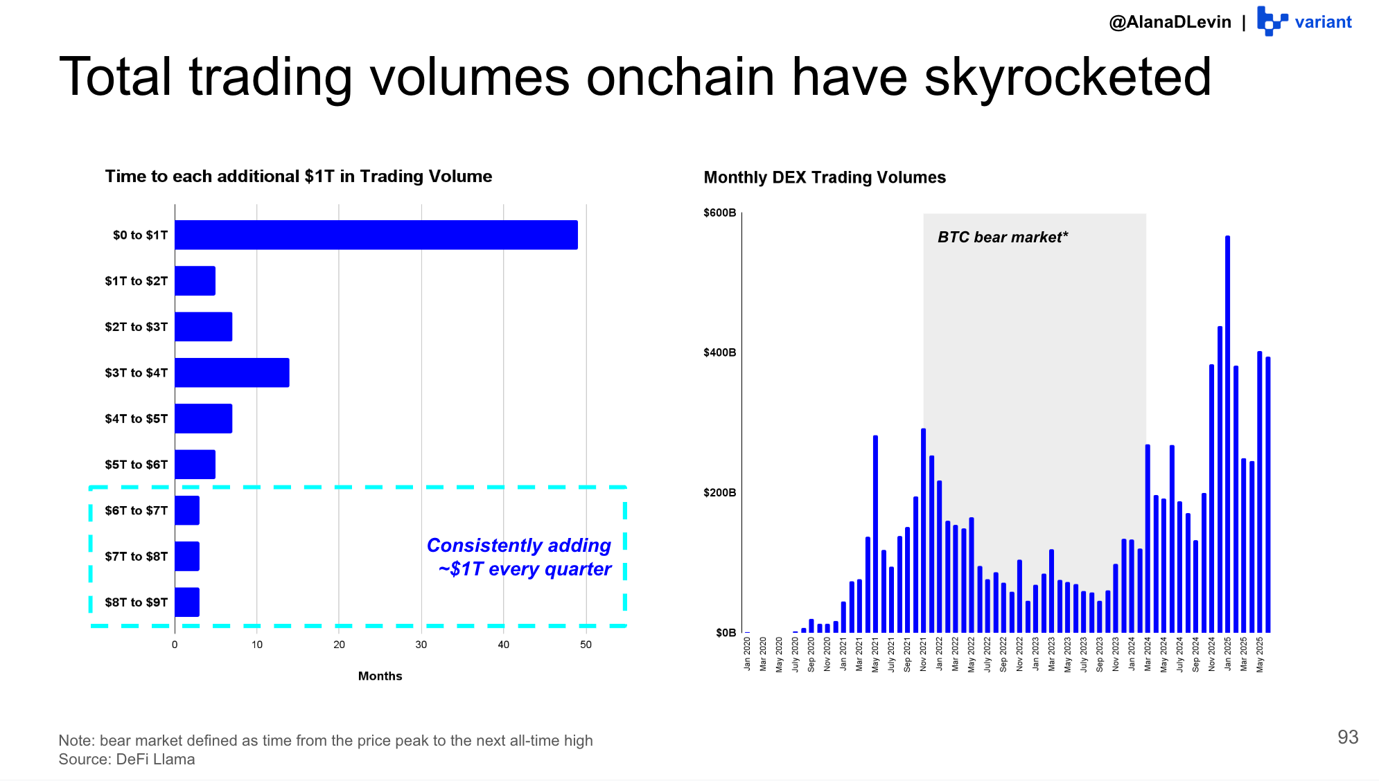 4. Onchain Activity: Curious about new, novel ways to utilize crypto assets? Then look onchain. It’s a hotbed of experimentation. Every element of the asset lifecycle – issuance, liquidity provision, exchange, listing, and productization – is permissionless and open on blockchain rails, whereas every one of these steps is gatekept in traditional finance. Such a setup dramatically expands the design space for creation and utilization. Furthermore, several categories of onchain protocols have begun to mature into solid businesses with strong fundamentals. Decentralized exchanges, lending platforms, token launchpads, and perps exchanges all have exciting signs of product market fit.