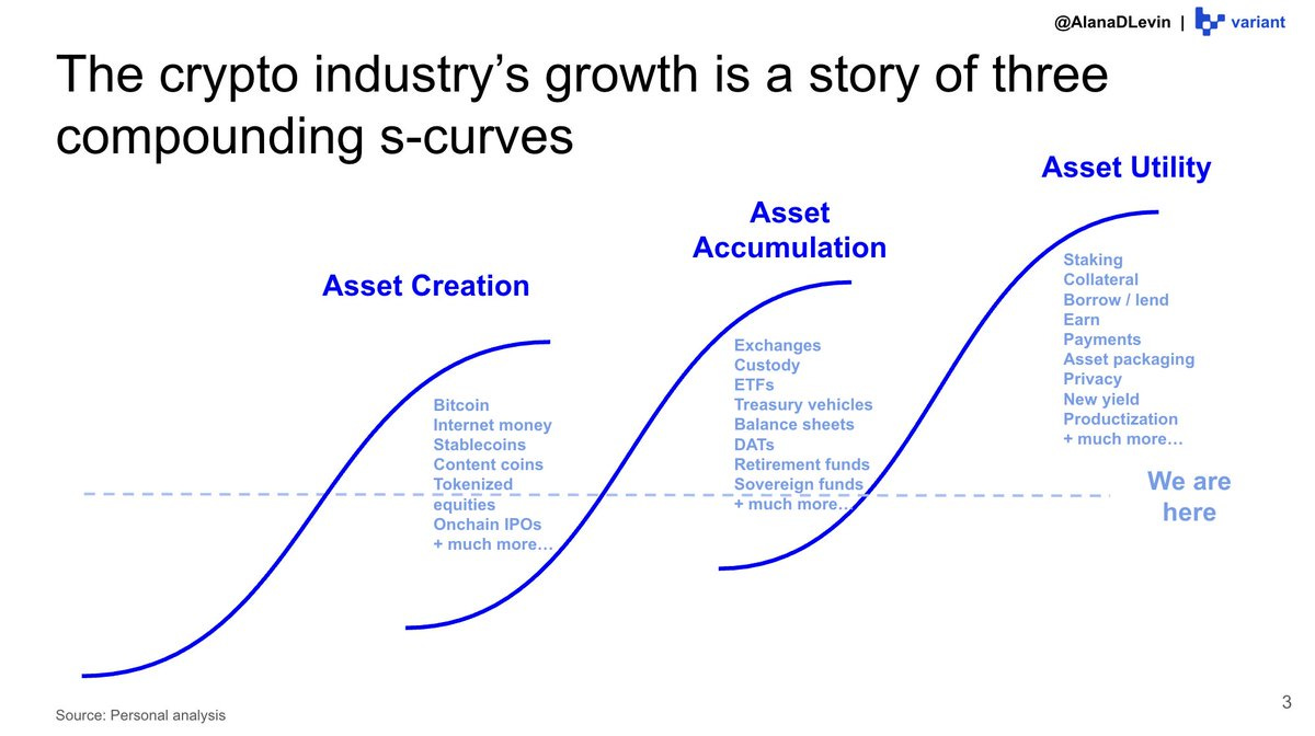 This report takes the perspective that the crypto industry’s growth can be viewed as a series of three compounding s-curves: asset creation, asset accumulation, and asset utilization.